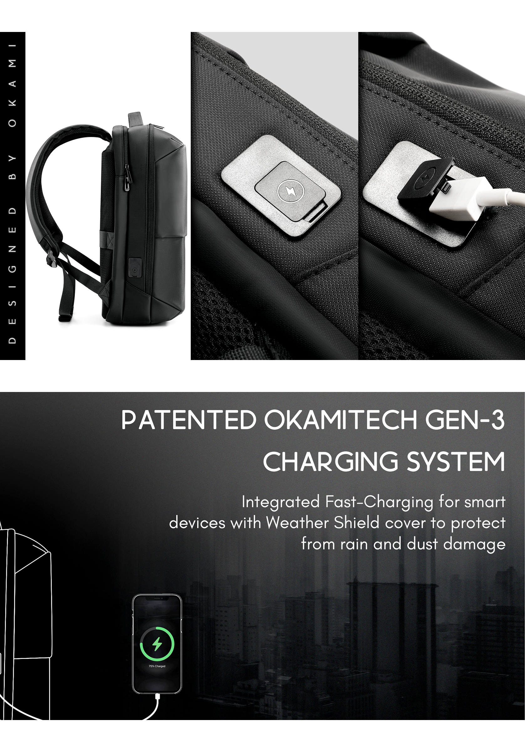 - Fast Charging System by Okami, integrated Fast-Charging for smart devices with Weather Shield cover to protect from rain and dust damage.