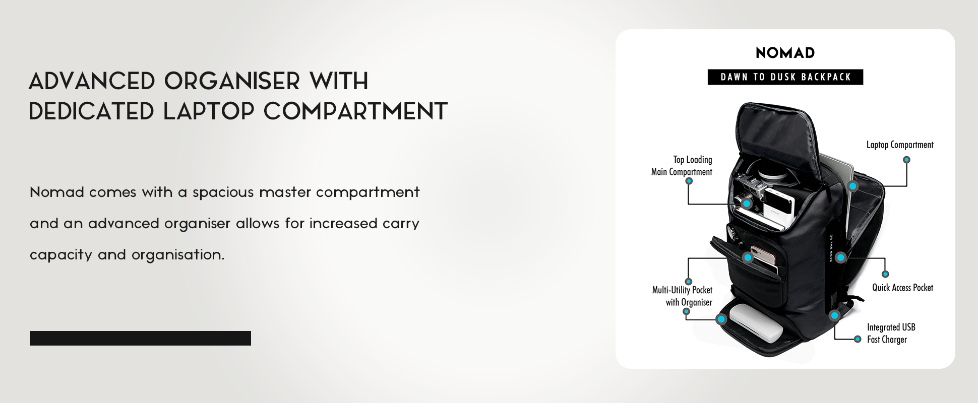 - Dual Quick Access side pockets, three pockets in the front, and a multi-utility organiser provide for efficient storage and packing options. The Nomad comes with a deep top-loading compartment with an interior organiser, and a metal key-hook