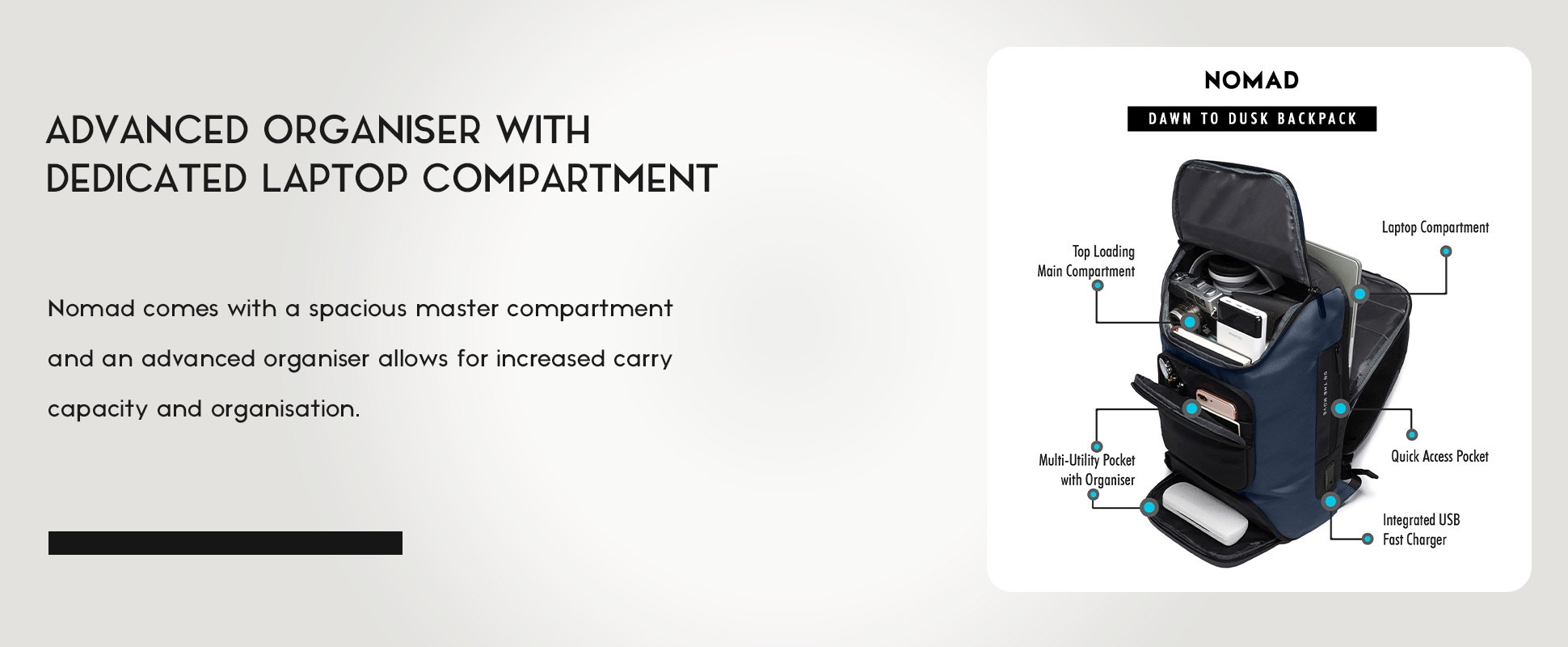 - Dual Quick Access side pockets, three pockets in the front, and a multi-utility organiser provide for efficient storage and packing options. The Nomad comes with a deep top-loading compartment with an interior organiser, and a metal key-hook