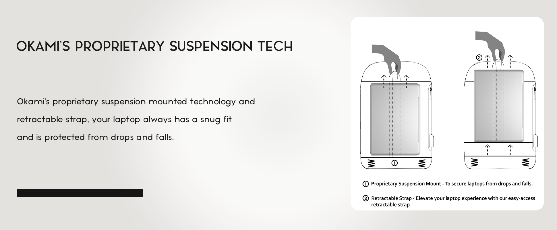 - Laptop Compartment for laptops up to 15.6", with Okami's proprietary suspension mounted technology and retractable strap, your laptop always has a snug fit and is protected from drops and falls