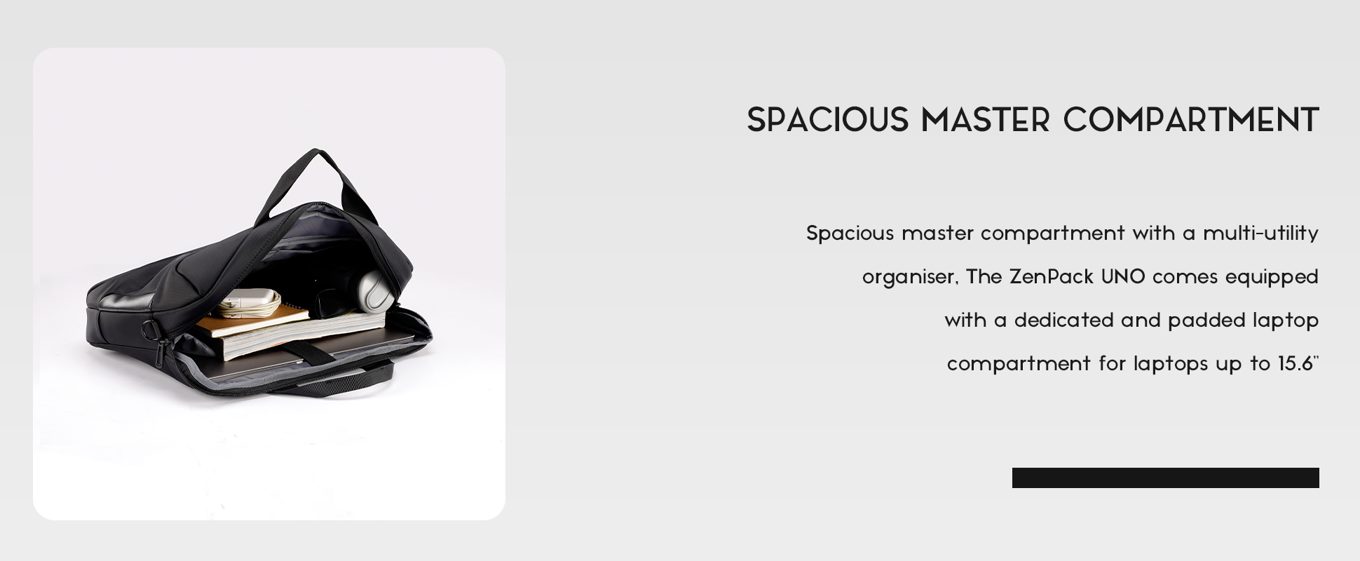 - The ZenPack UNO comes equipped with a dedicated and padded laptop compartment for laptops up to 15.6" and spacious main compartment with a multi-utility organiser