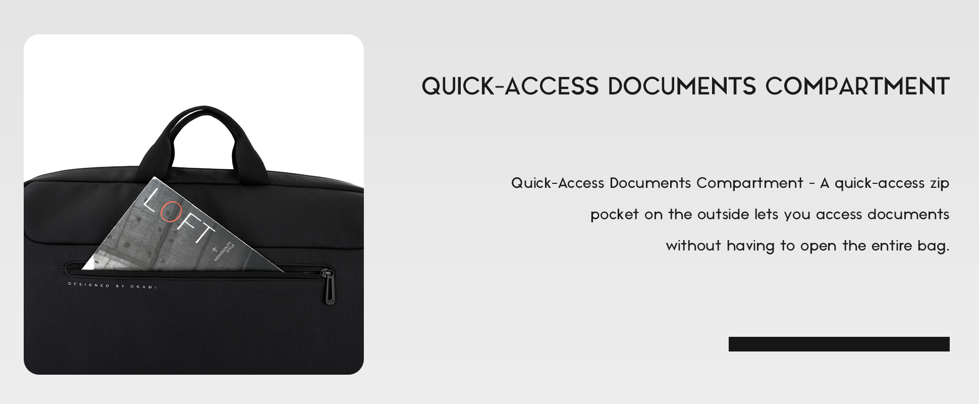 - Backed by Okami's 365 day warranty with free pick and drop facility across India. Quick-Access Documents Compartment - A quick access slip pocket on the outside lets you access documents without having to open the entire bag.