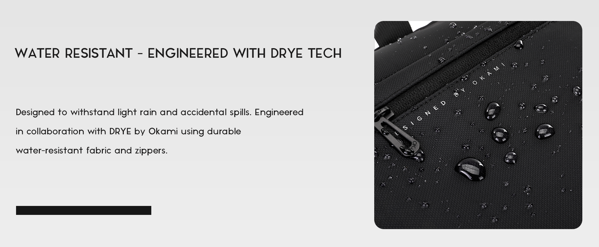 - Water Resistant - Engineered with DRYE Tech Designed to withstand light rain and accidental spills. Engineered in collaboration with DRYE by Okami using durable water-resistant fabric and zippers.