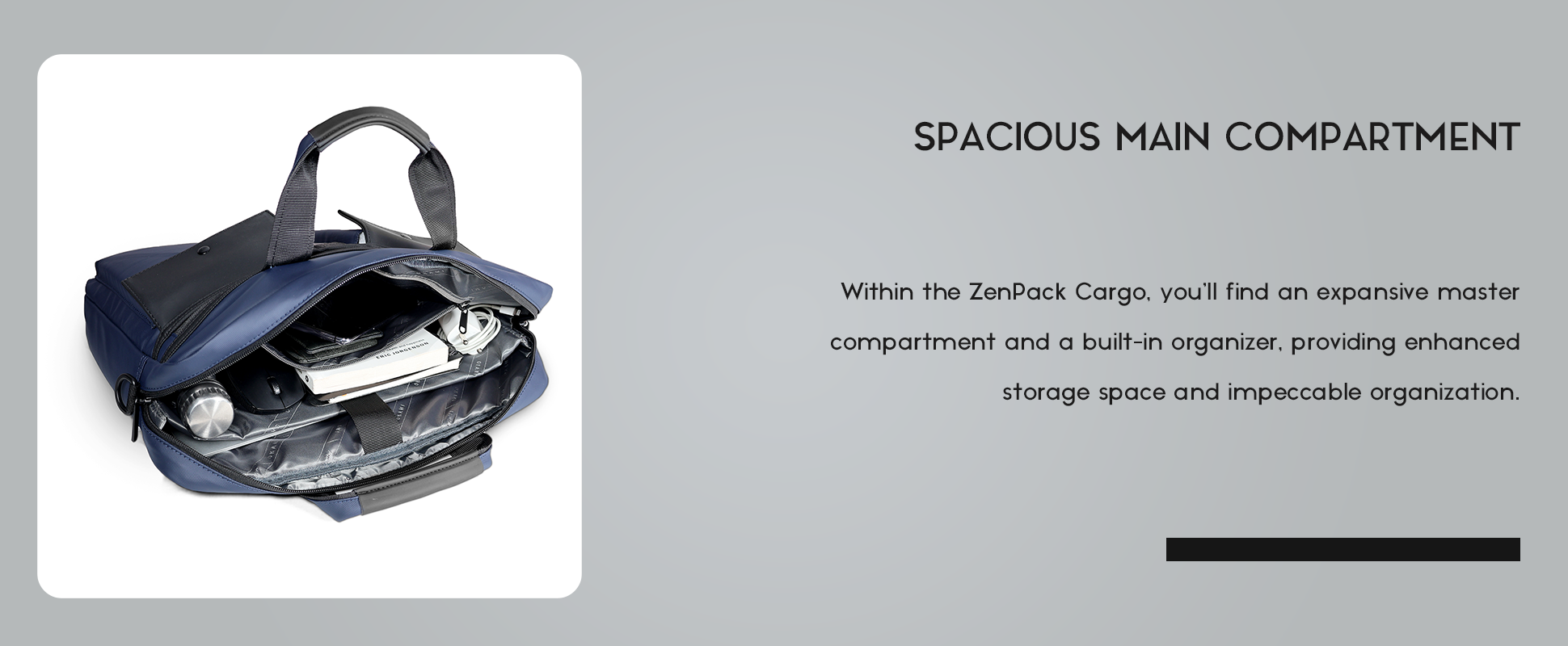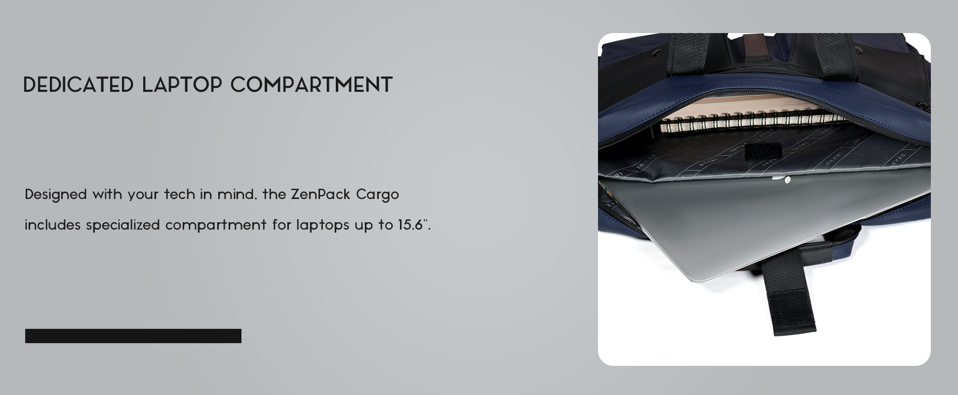 - The ZenPack Cargo is designed to cater to the needs of modern professionals with its 'CARGO' features. Its dedicated laptop compartment can securely hold laptops up to 15.6 inches, while the spacious master 'CARGO' compartment provides ample storage and organization for documents, notebooks, and other essentials