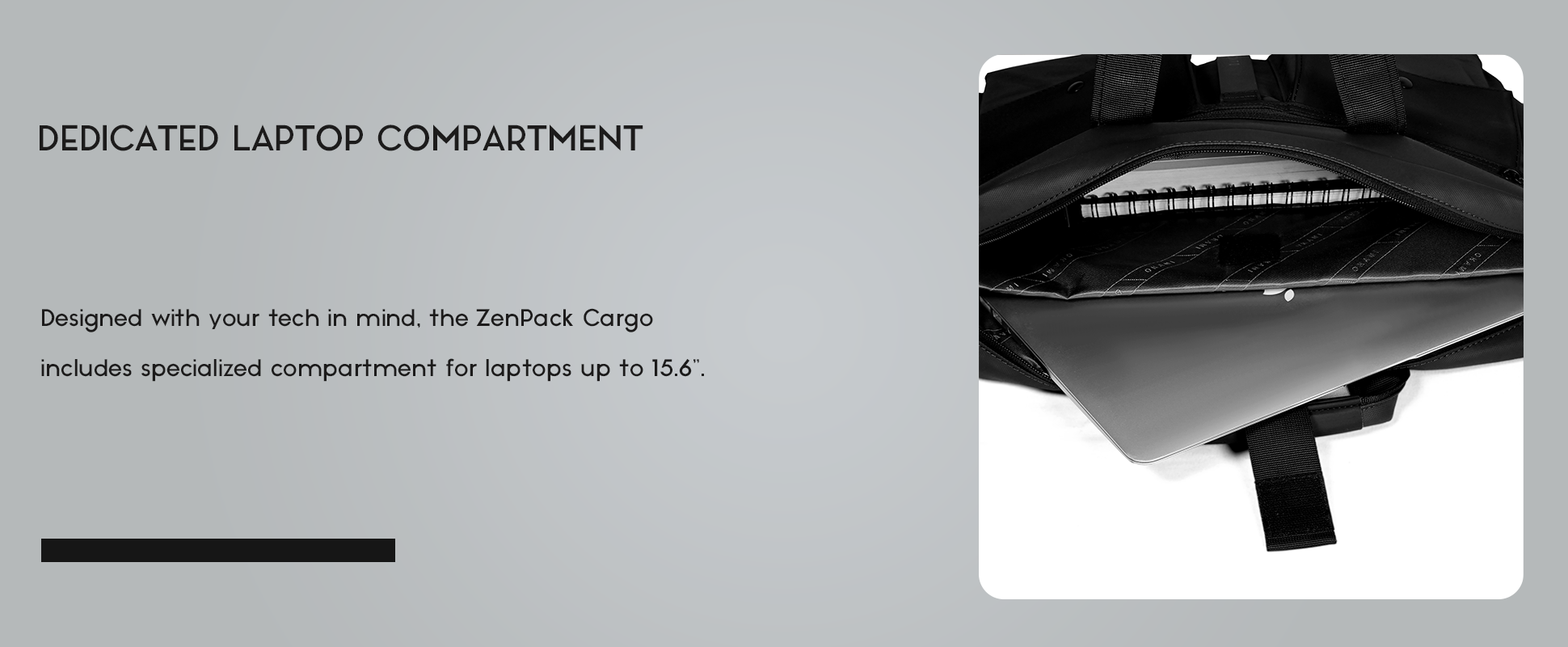 - The ZenPack Cargo is designed to cater to the needs of modern professionals with its 'CARGO' features. Its dedicated laptop compartment can securely hold laptops up to 15.6 inches, while the spacious master 'CARGO' compartment provides ample storage and organization for documents, notebooks, and other essentials