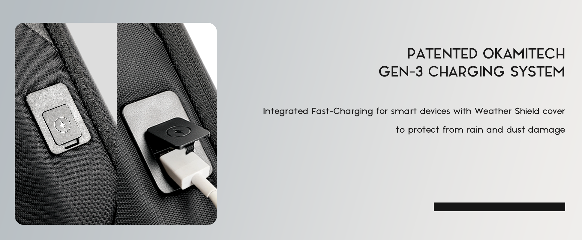 Fast Charging System by Okami, integrated Fast-Charging for smart devices with Weather Shield cover to protect from rain and dust damage. The ZenPack is the only messenger bag with Okami's industry-leading charging system.