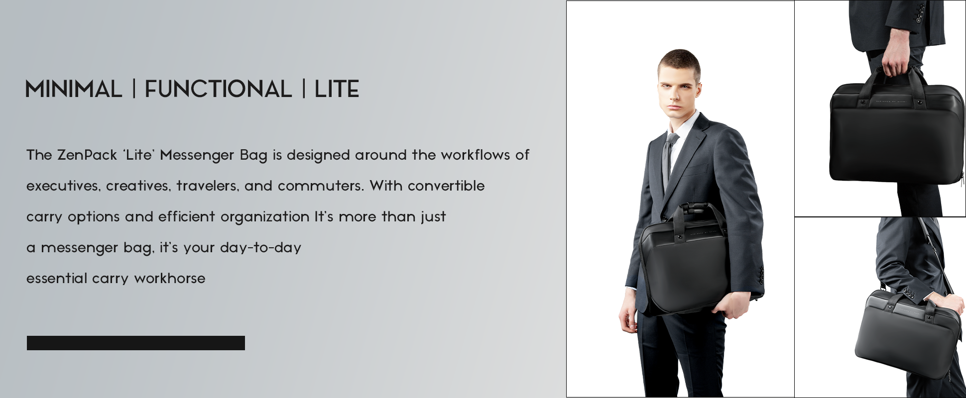 Convertible Carry - MESSENGER X BRIEFCASE Carry as a messenger or a briefcase, the ZenPack LITE is suitable for both. The included detachable padded shoulder straps come with heavy-duty metal hardware and luxurious vegan leather inserts. With durable construction and robust materials, tackle your everyday commute with ease.