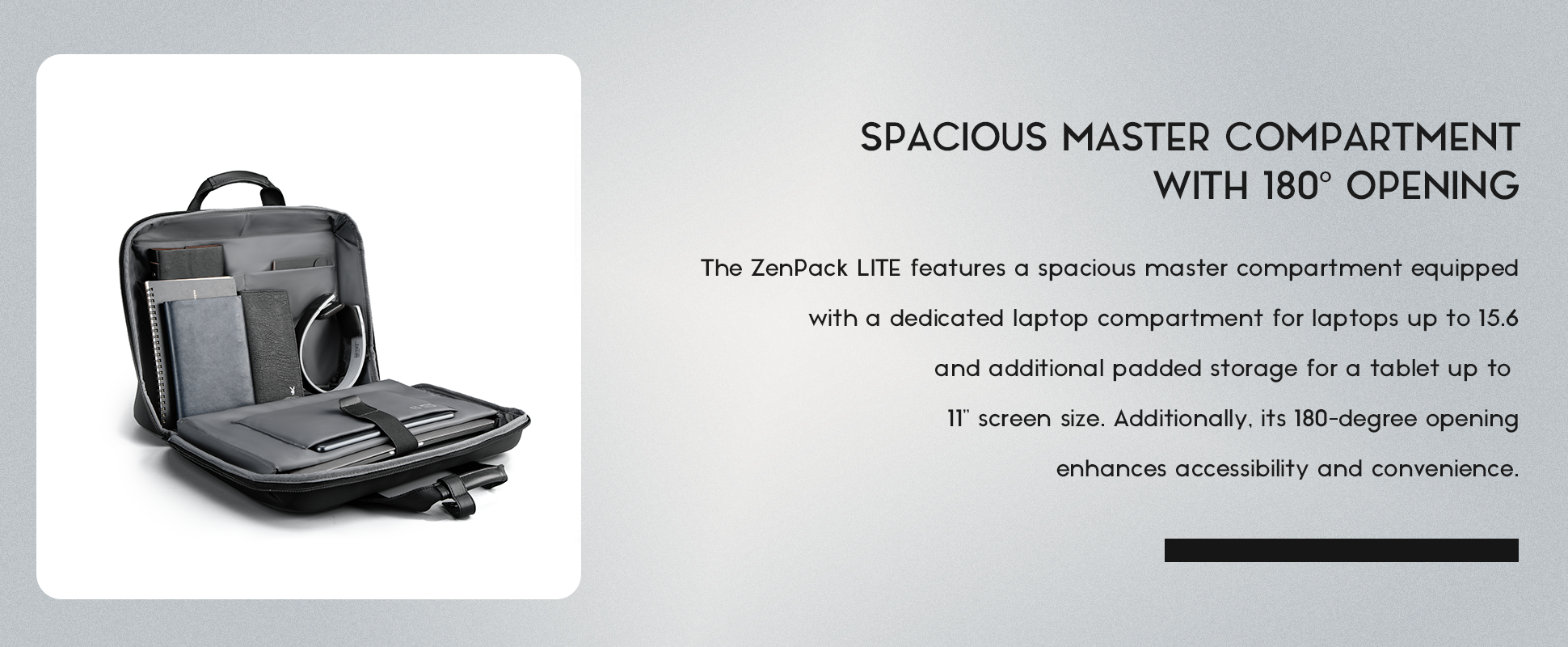 The ZenPack LITE comes equipped with a dedicated laptop compartment for laptops up to 15.6" and additional padded storage for a tablet up to 11" screen size. A spacious master compartment allows for increased carry capacity and organisation. In total, it offers three compartments, providing enhanced organization and carry capacity.